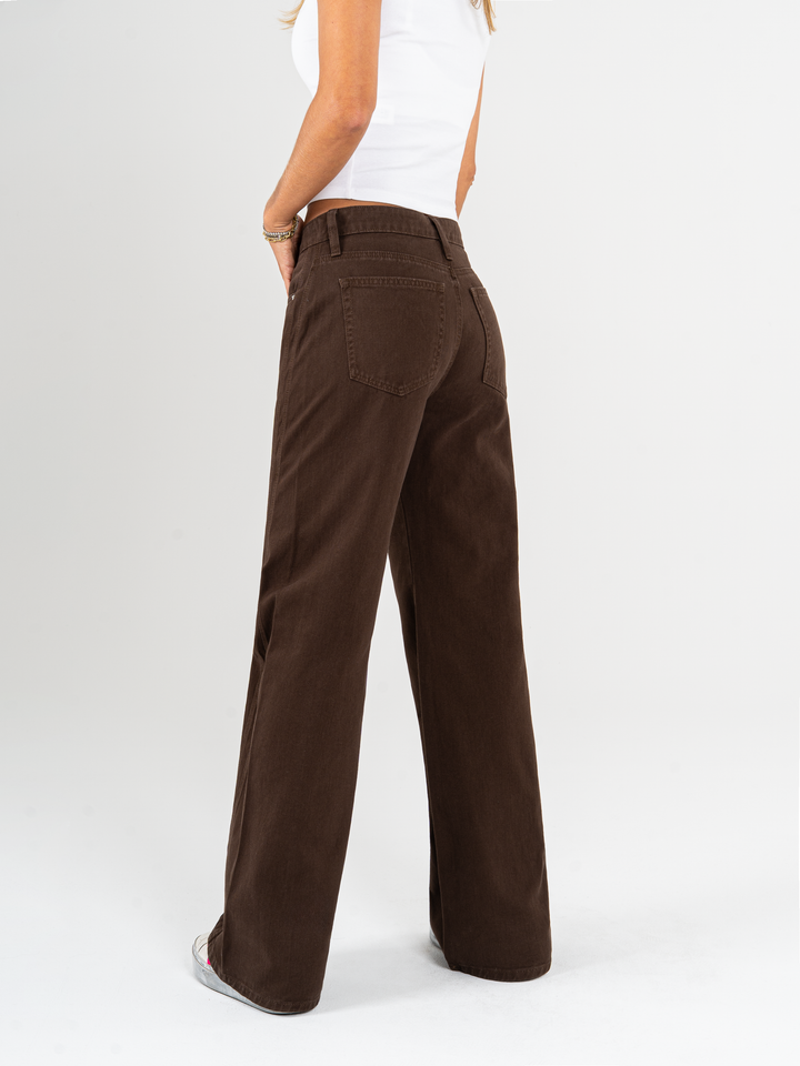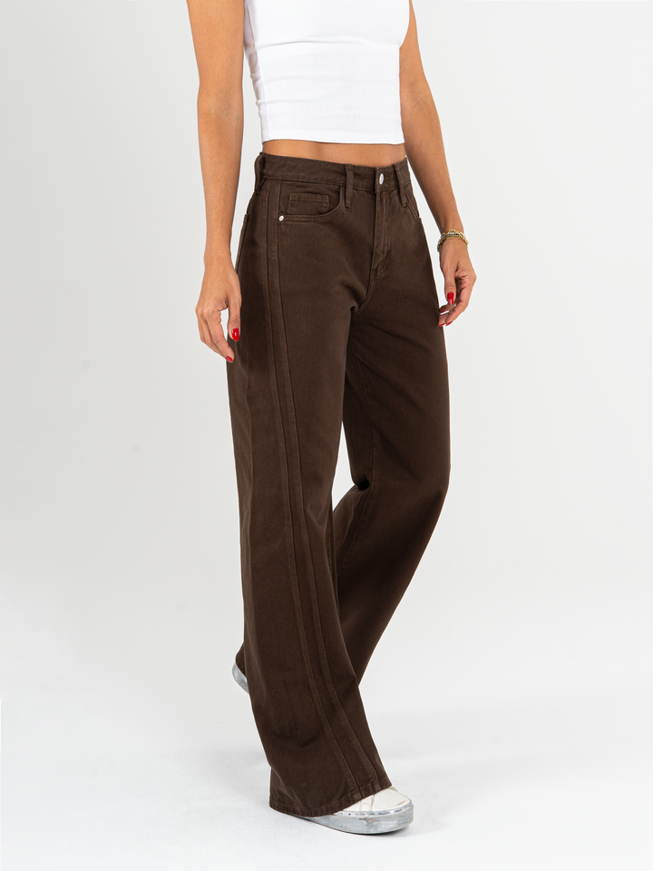 Pantalón wide leg, tiro medio, rígido, tono café, diseño 5 bolsillos, silueta amplia.