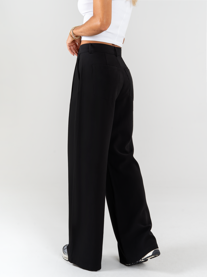 Pantalón palazzo, prenses, tono negro, tejido plano liviano, tiro alto, bolsillo al diagonal, silueta amplia.