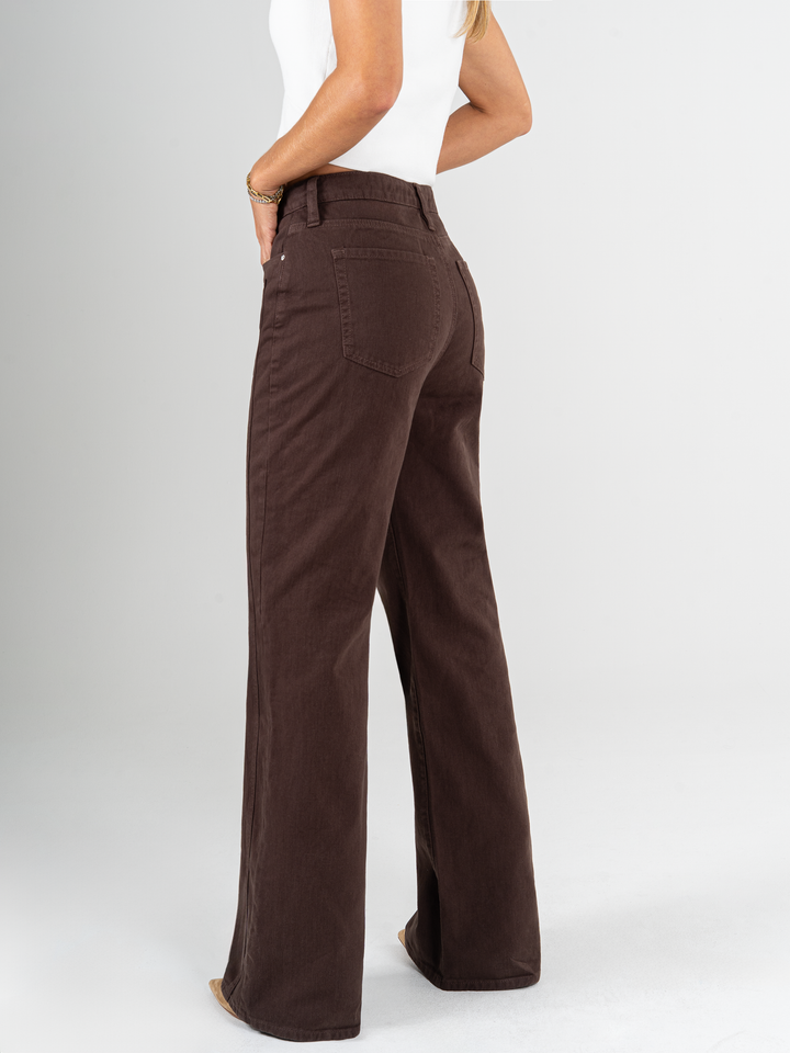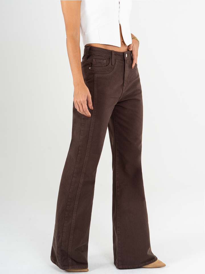 Pantalón mom flare, rígido, con cortes, tiro alto, cafe, cintura ajustada, pierna holgada, diseño cinco bolsillos.