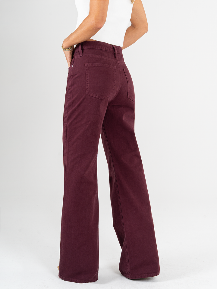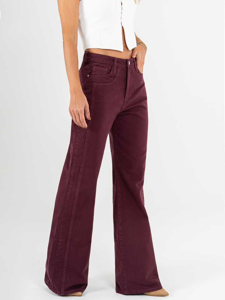 Pantalón mom flare, rígido, con cortes, tiro alto, vino tinto, cintura ajustada, pierna holgada, diseño cinco bolsillos.