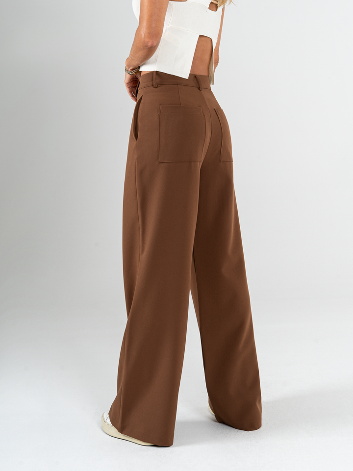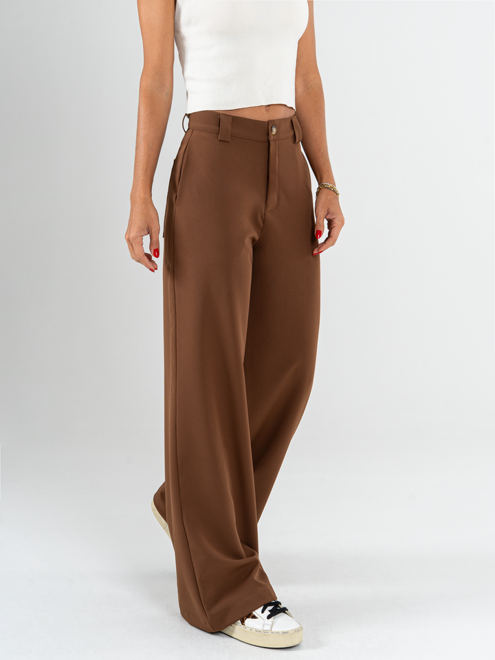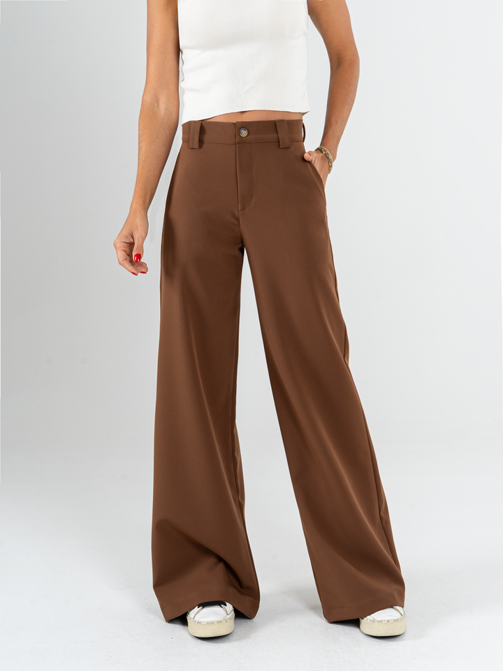 Pantalón palazzo, sin prenses, stretch, tejido plano liviano, tiro alto, tono café, bolsillo ribete, silueta amplia.