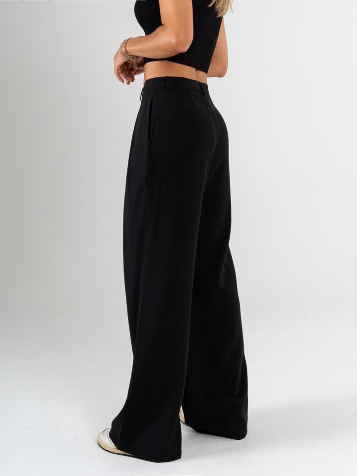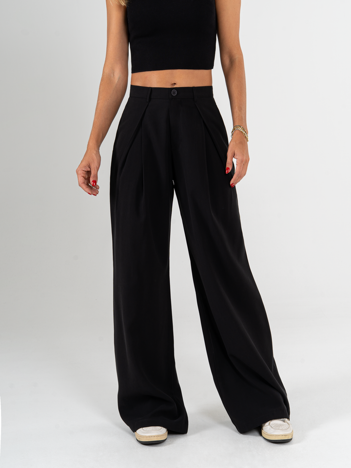 Pantalón palazo, con prenses, tejido plano liviano, tiro alto, tono negro, bolsillo diagonal, silueta amplia.