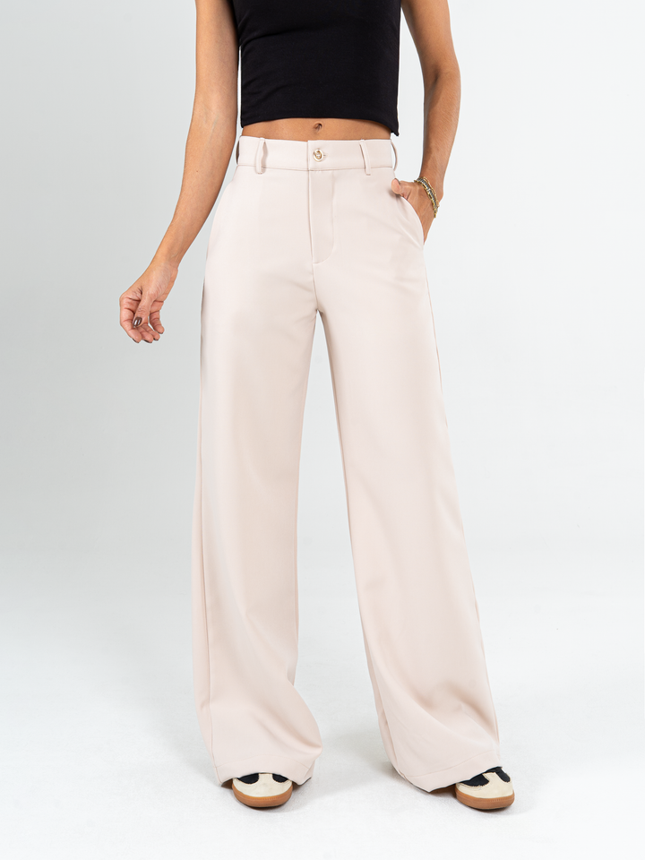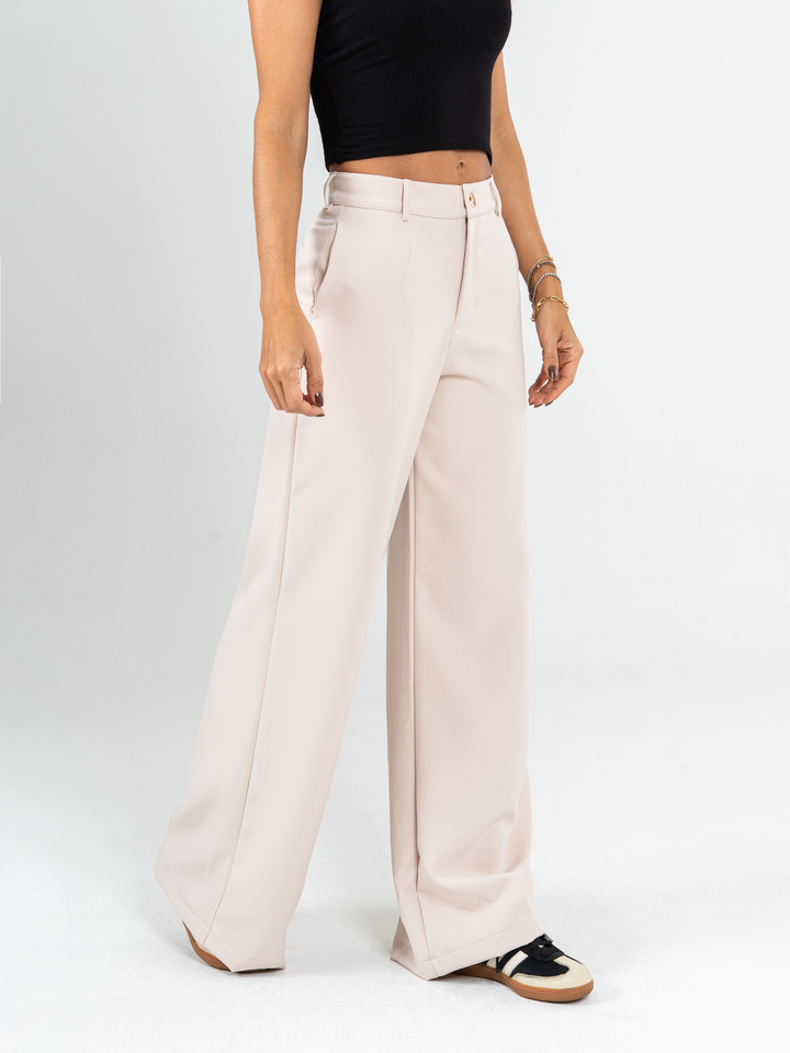 Ref: 069497 Pantalón straight leg, sin prense, tono ivory, tejido plano liviano, tiro alto, detalle en pretina