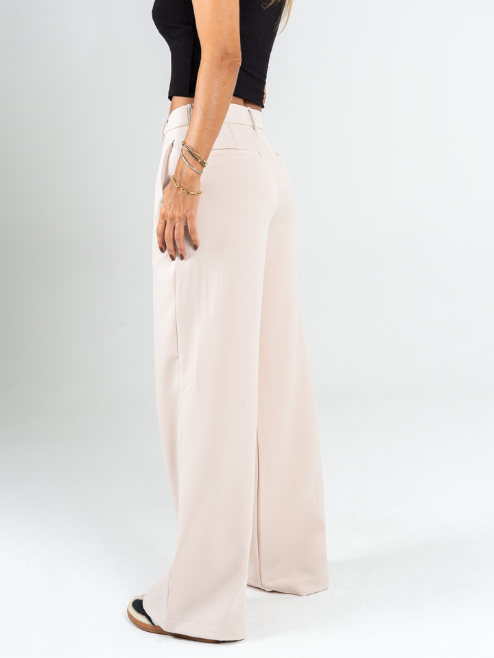 Pantalón palazzo, stretch, sin prense, tono arena, tejido plano liviano, tiro alto, bolsillo ribete, silueta amplia.