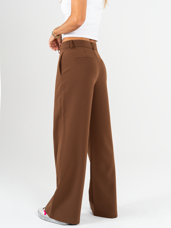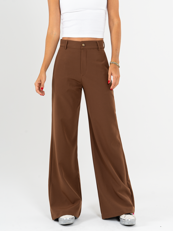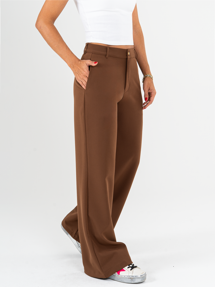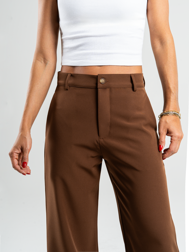 Pantalón palazzo, stretch, sin prense, tono cafe, tejido plano liviano, tiro alto, bolsillo ribete, silueta amplia.