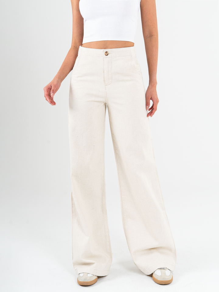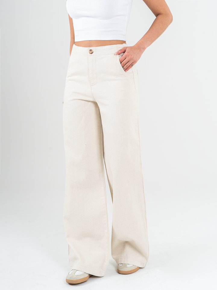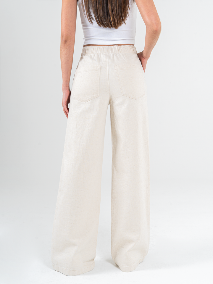 Pantalón palazzo, tejido plano rígido, tipo lino, tiro alto, pretina resortada, tono natural, bolsillo diagonal, silueta amplia.