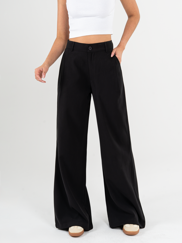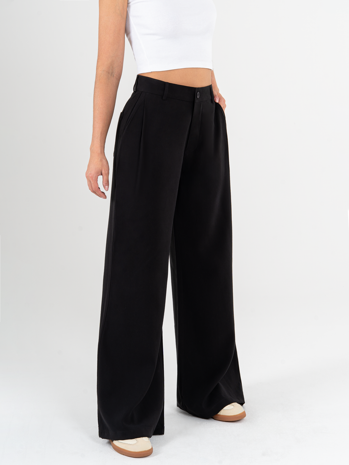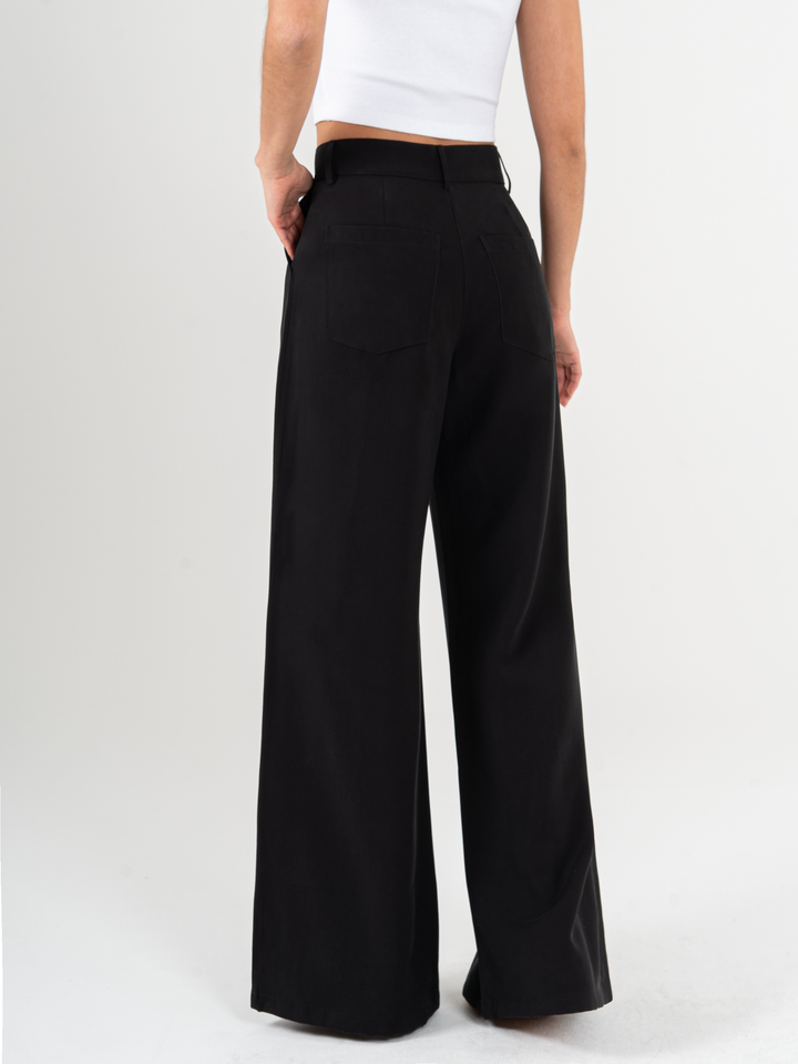 Pantalón palazzo, prenses, tono negro, tejido plano liviano, tiro alto, bolsillo al diagonal, silueta amplia.