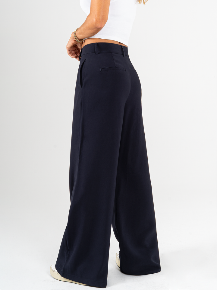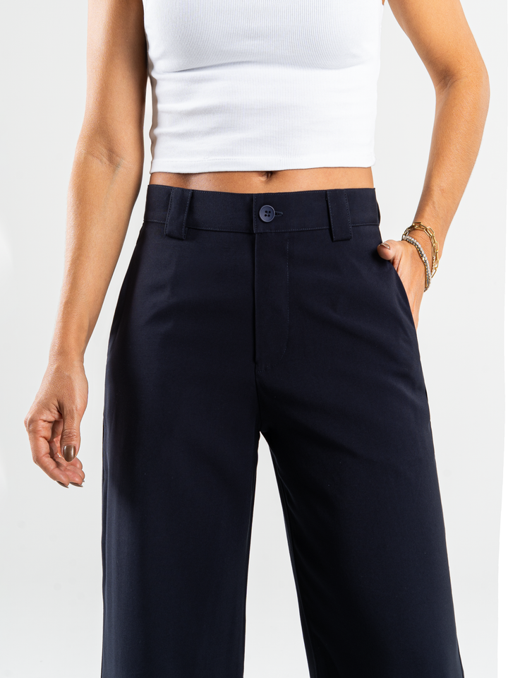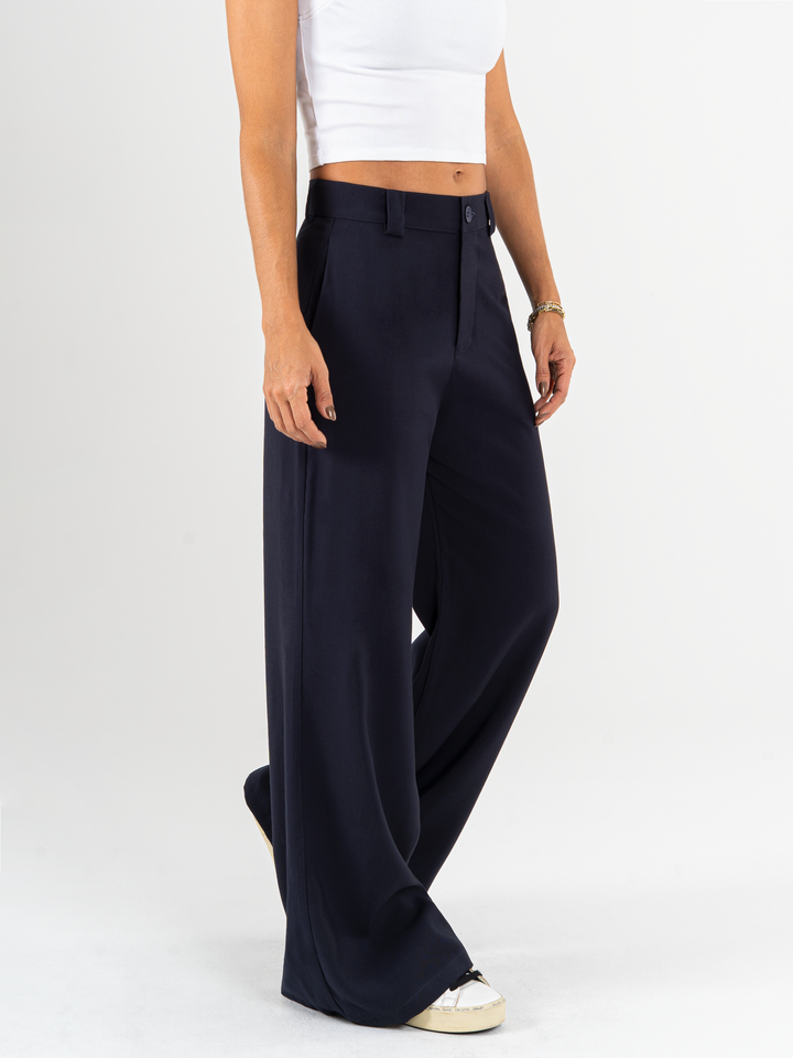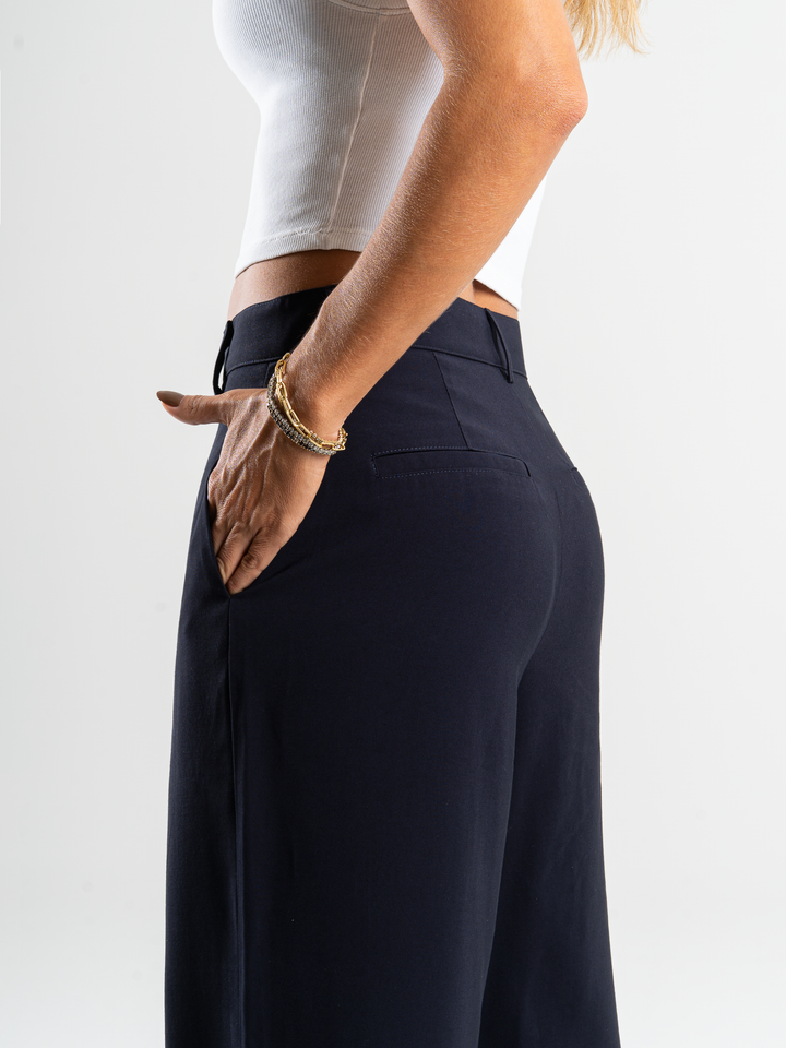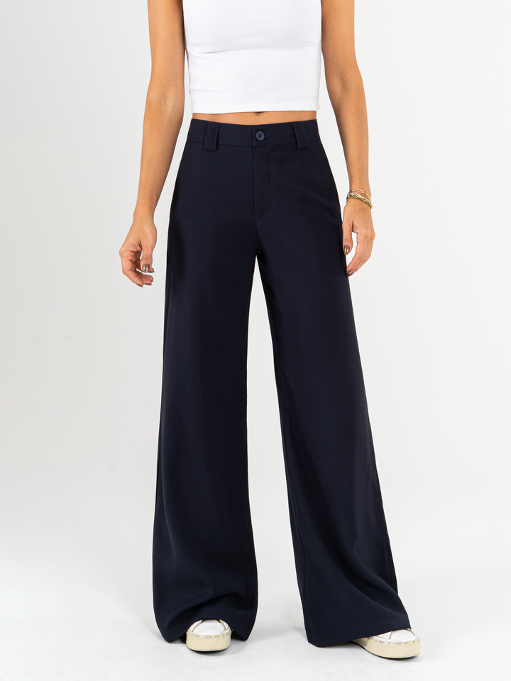 Pantalón palazzo, sin prenses, tono azul oscuro, tejido plano liviano, tiro alto, bolsillo ribete, silueta amplia.