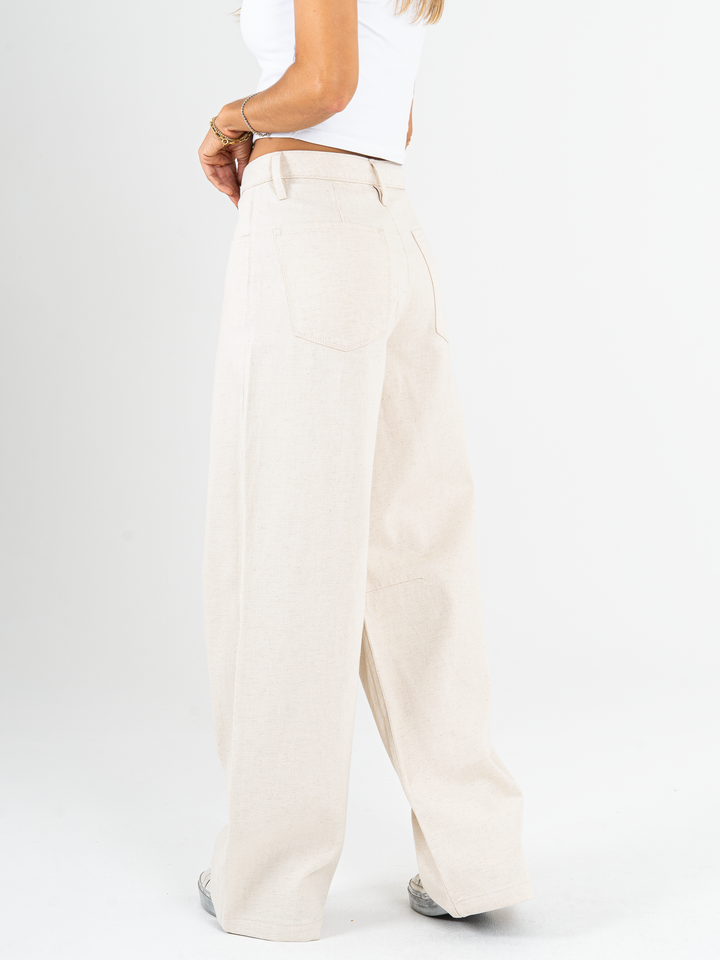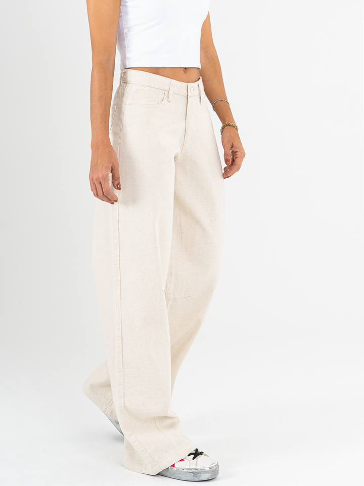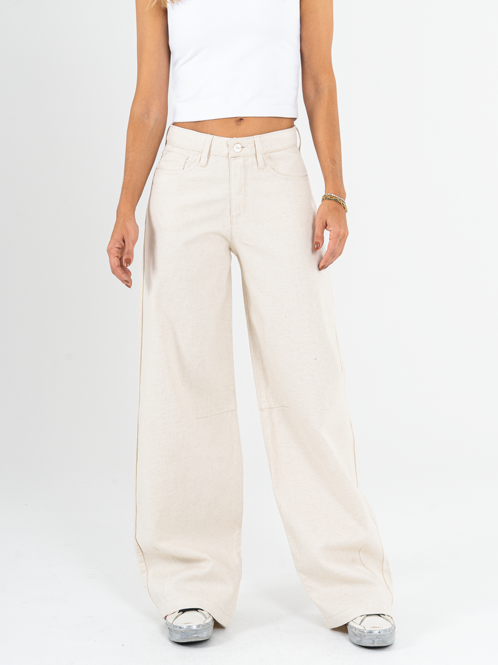 Pantalón wide leg, tiro alto, tono natural, tejido plano rígido, tipo lino, diseño con cortes, silueta amplia