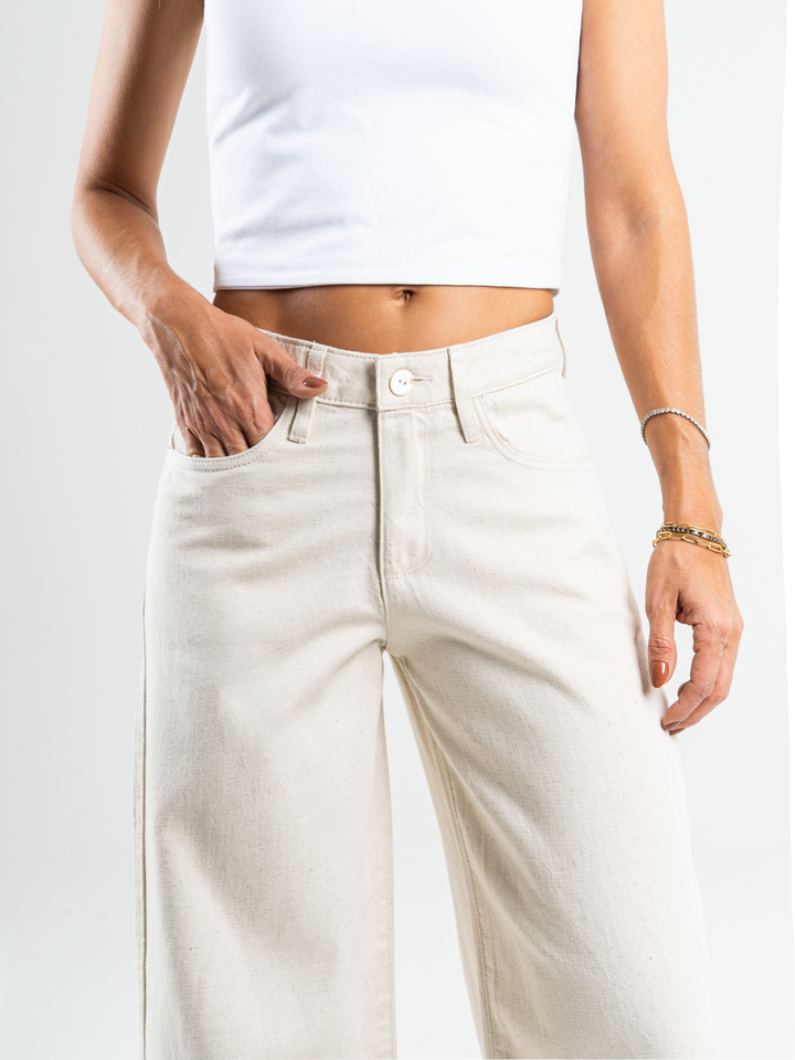 Ref: 069497 Pantalón straight leg, sin prense, tono ivory, tejido plano liviano, tiro alto, detalle en pretina