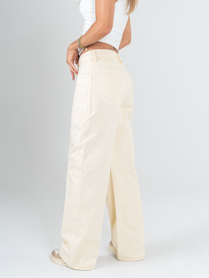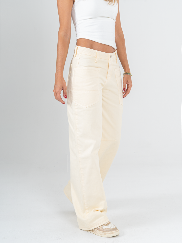 Ref: 069497 Pantalón straight leg, sin prense, tono ivory, tejido plano liviano, tiro alto, detalle en pretina