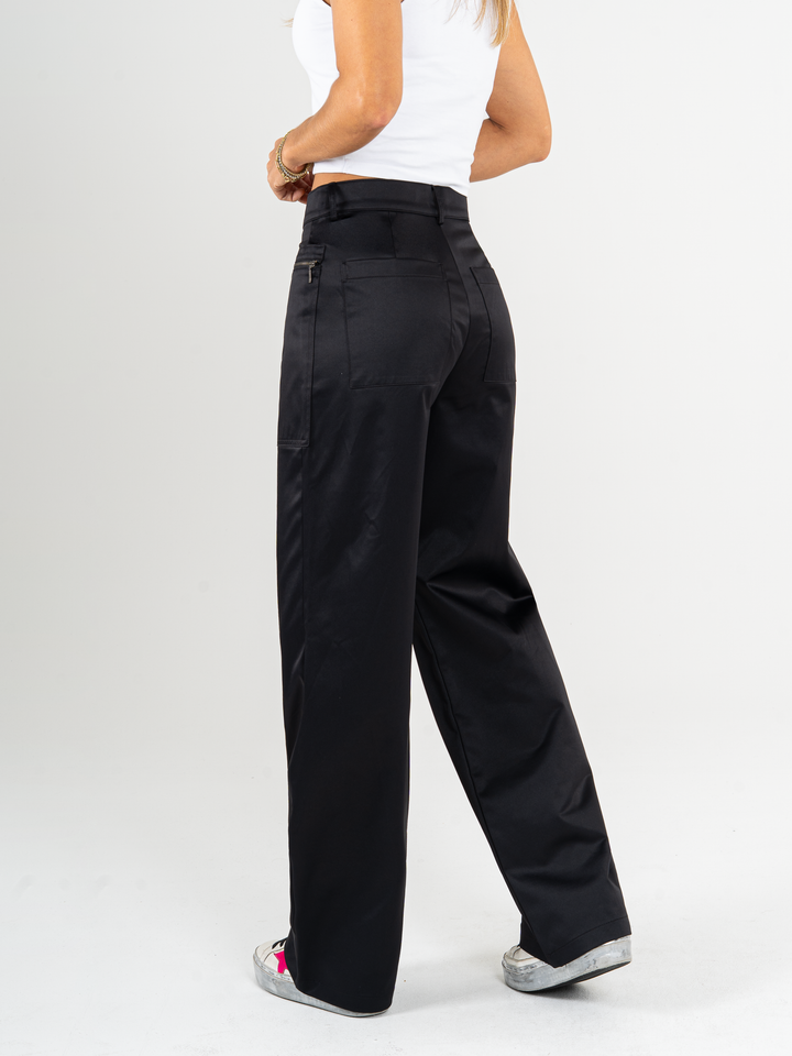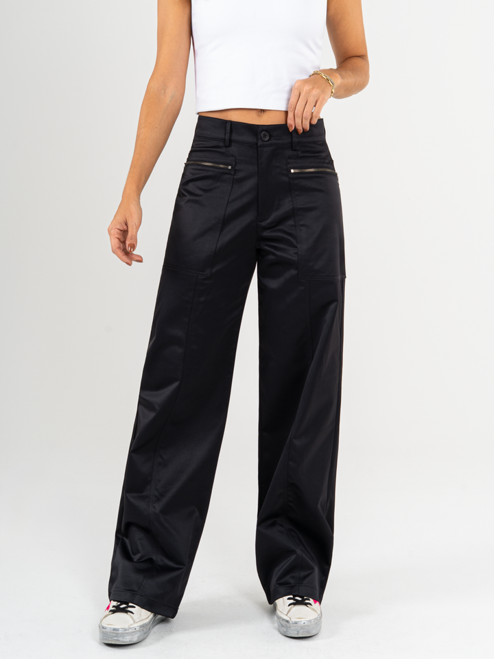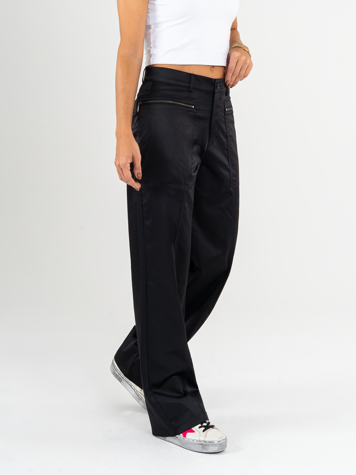 Pantalón mom flare, tejido plano liviano, detalle cierres, tono negro, silueta amplia.