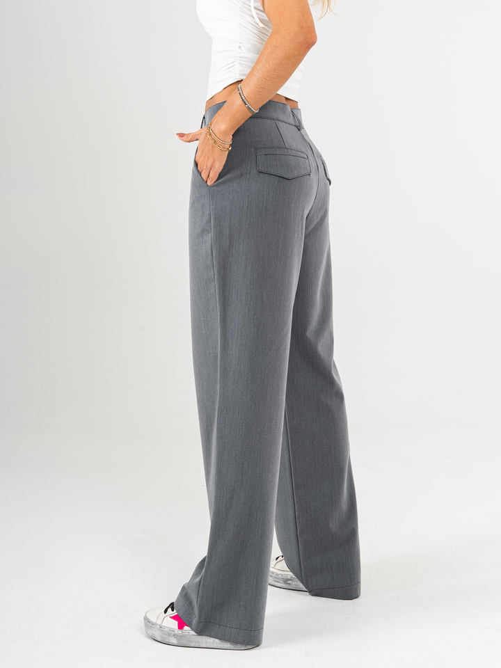Pantalón straight leg, stretch, tono gris, tiro alto, tejido plano liviano, bolsillo tapas, silueta amplia.