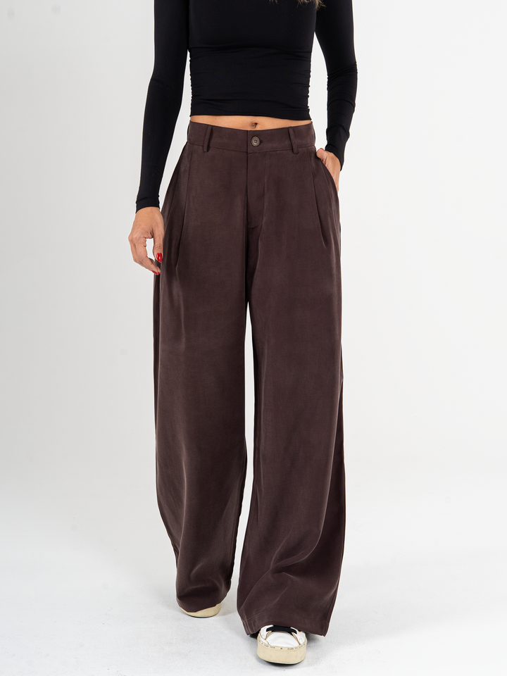 Pantalón palazzo, prenses, tono café, tejido plano liviano, tiro alto, bolsillo al diagonal, silueta amplia.